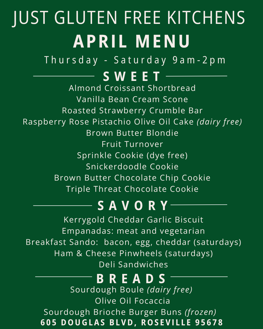 We’re open to the public Wednesdays for Lunch from 11:30-2pm and Thursdays - Saturdays 9am-2pm featuring sweet and savory baked goods.
